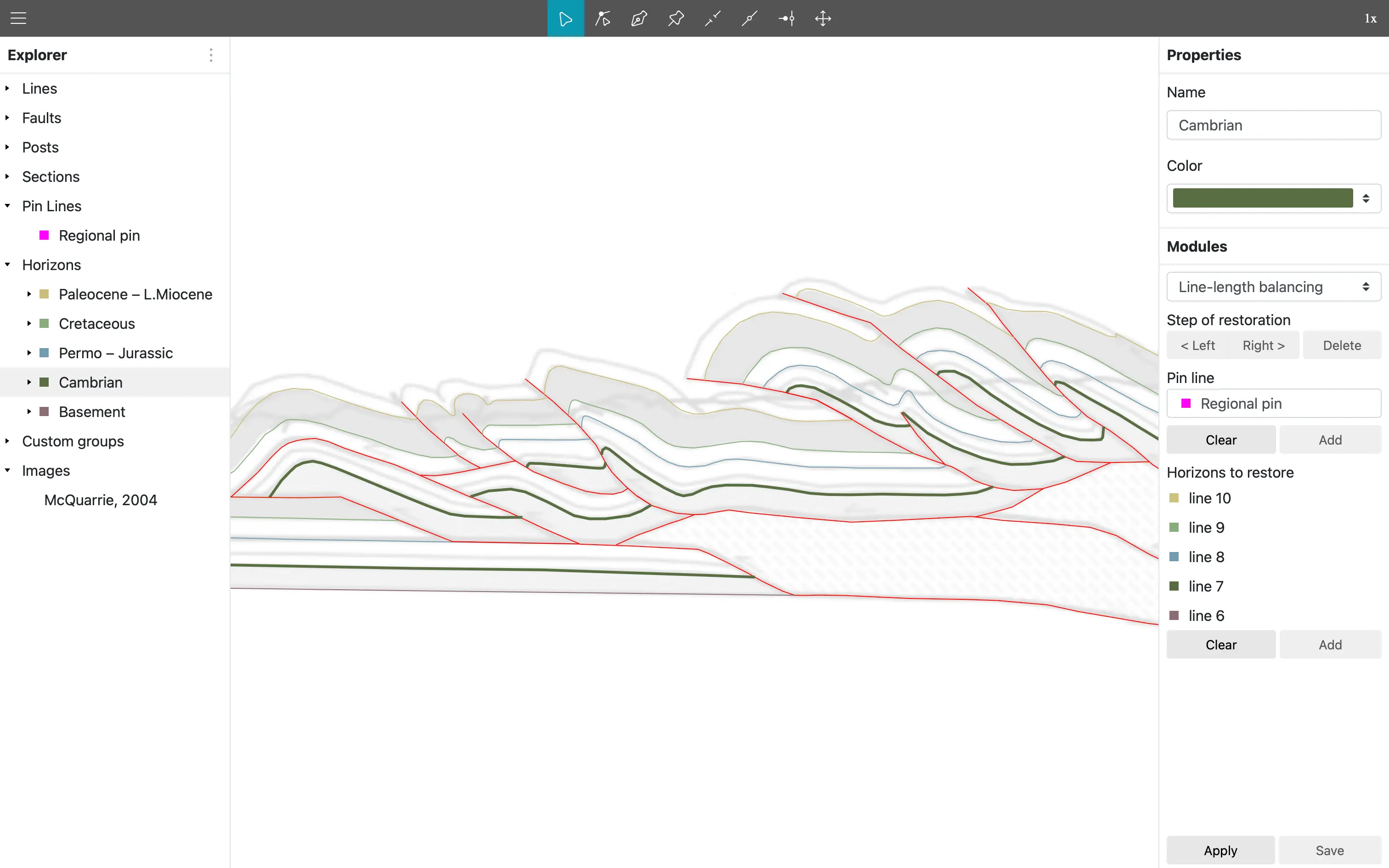 Creation, editing and assignment of lines to horizons, faults or custom groups by users (e.g., tectonic history or different interpretation versions).